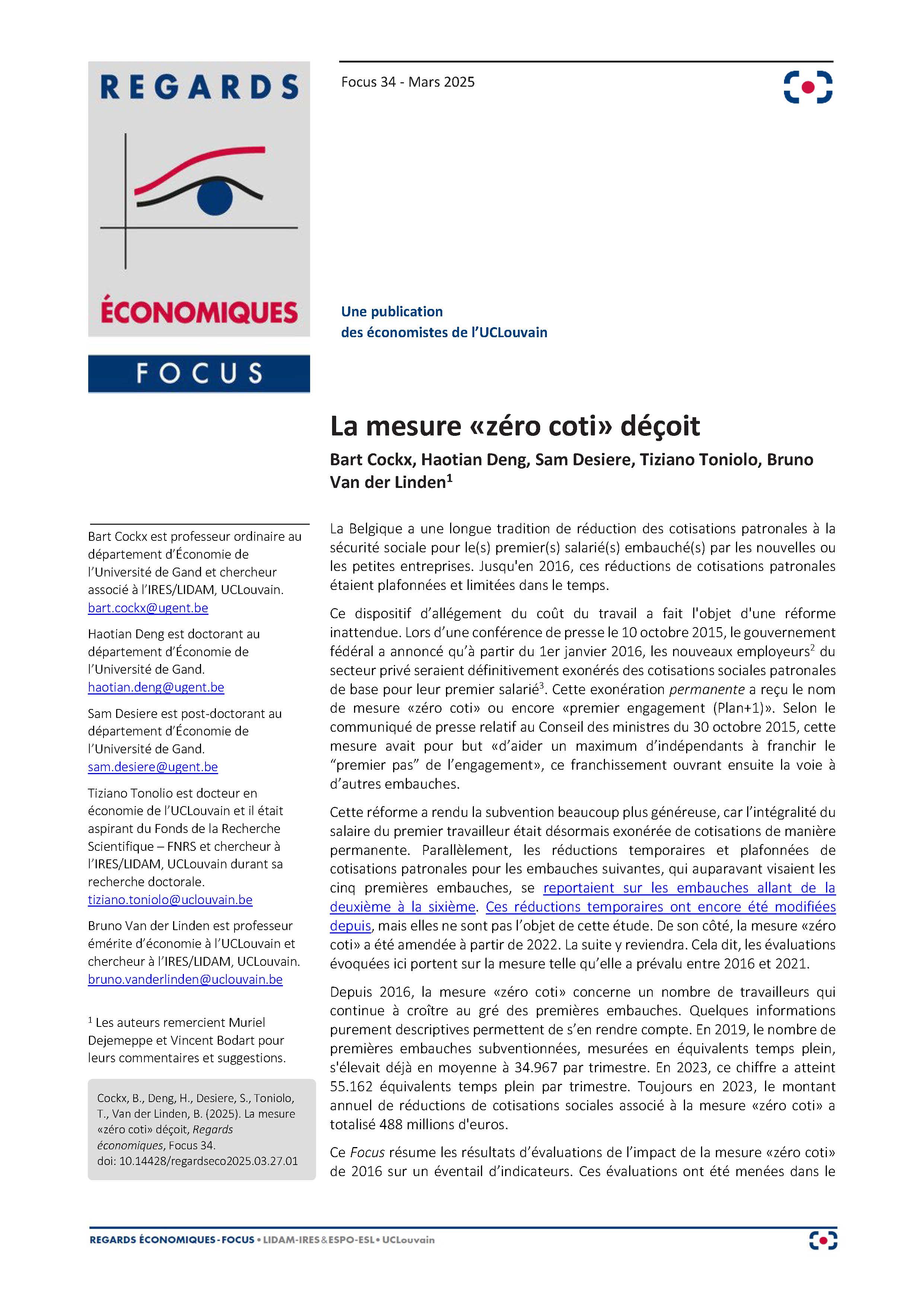 - Belga Wire, 31.03.2025 : "La mesure "zéro cotisation" a un coût élevé et des résultats mitigés (UGent et UCLouvain)"